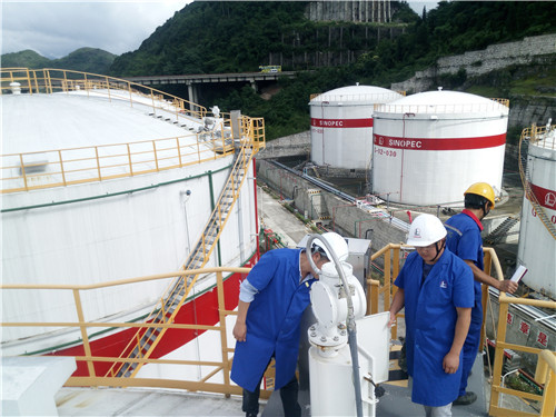 同時(shí)與油庫(kù)技術(shù)人員開(kāi)展了油庫(kù)機(jī)房、中控室、發(fā)油臺(tái)、油量監(jiān)控設(shè)備等重要部位的防雷技術(shù)交流和技術(shù)難題現(xiàn)場(chǎng)答疑。圖為油罐頂部防雷安全隱患排查。